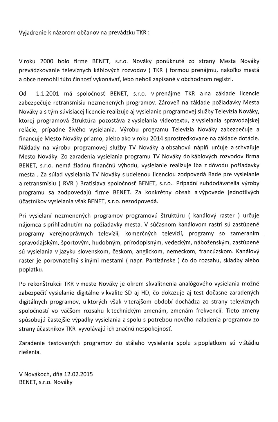Dobrý večer, obdržal som vyjadrenie od firmy BENET, s.r.o. ohľadom TKR.